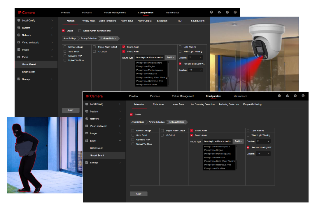 Phát hiện thông minh: dựa trên hình người và phương tiện (xâm nhập, vượt ranh giới, phát hiện tụ tập, vào/rời khu vực…).