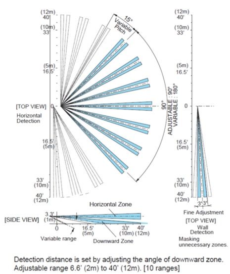 Dạng quét rẻ quạt 0–90°, khoảng cách phát hiện 2–12m.