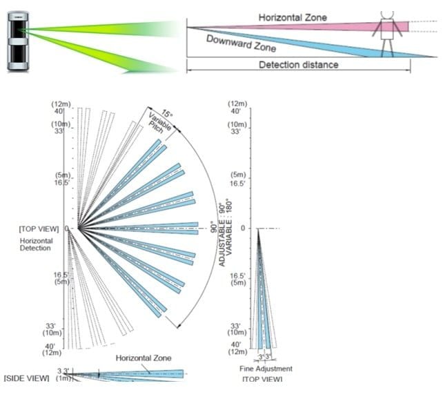 Linh hoạt lắp đặt: Có thể xoay cảm biến ±90°, kết hợp tấm che đi kèm để định hướng vùng phát hiện phù hợp như hàng rào, cửa sổ, tường, ban công, sân, kho, xưởng,…